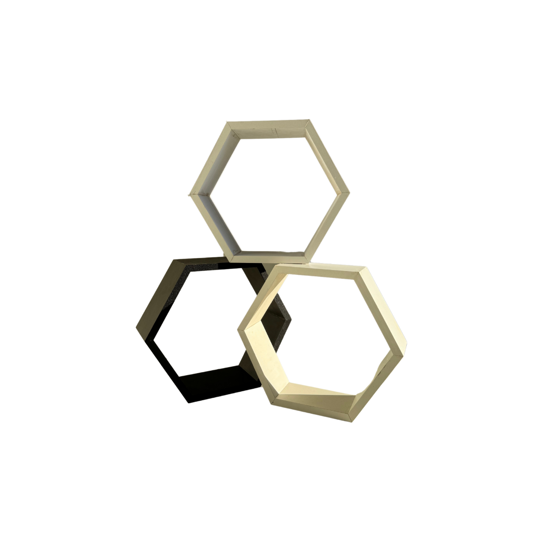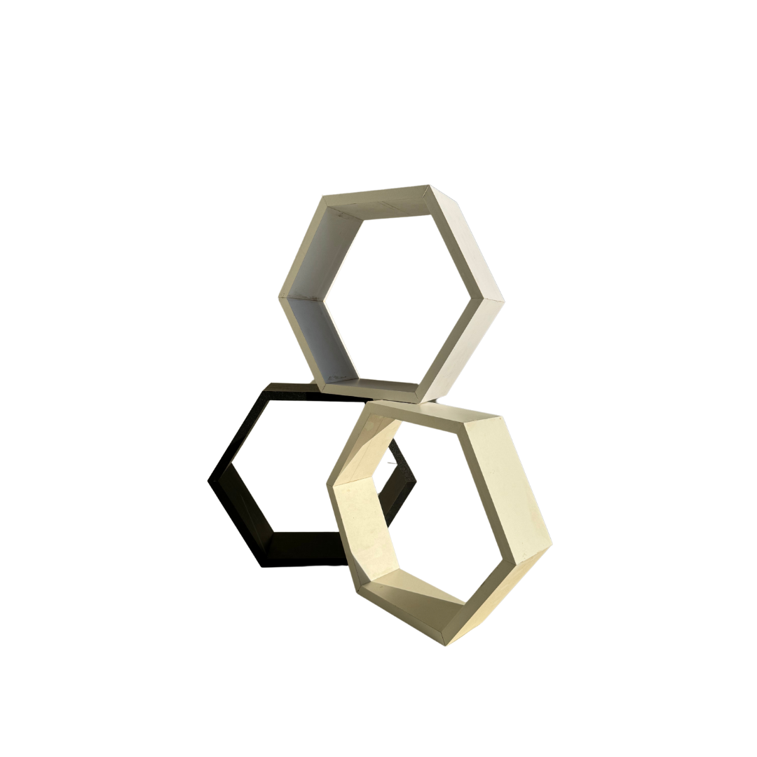 Diseño decorativo inspirado en la geometría natural. Este set de estantes hexagonales en tres colores ofrece múltiples combinaciones para pared o sobremueble. Fabricados en melamina de 18mm, son livianos, resistentes y aportan un toque original a cualquier espacio.
